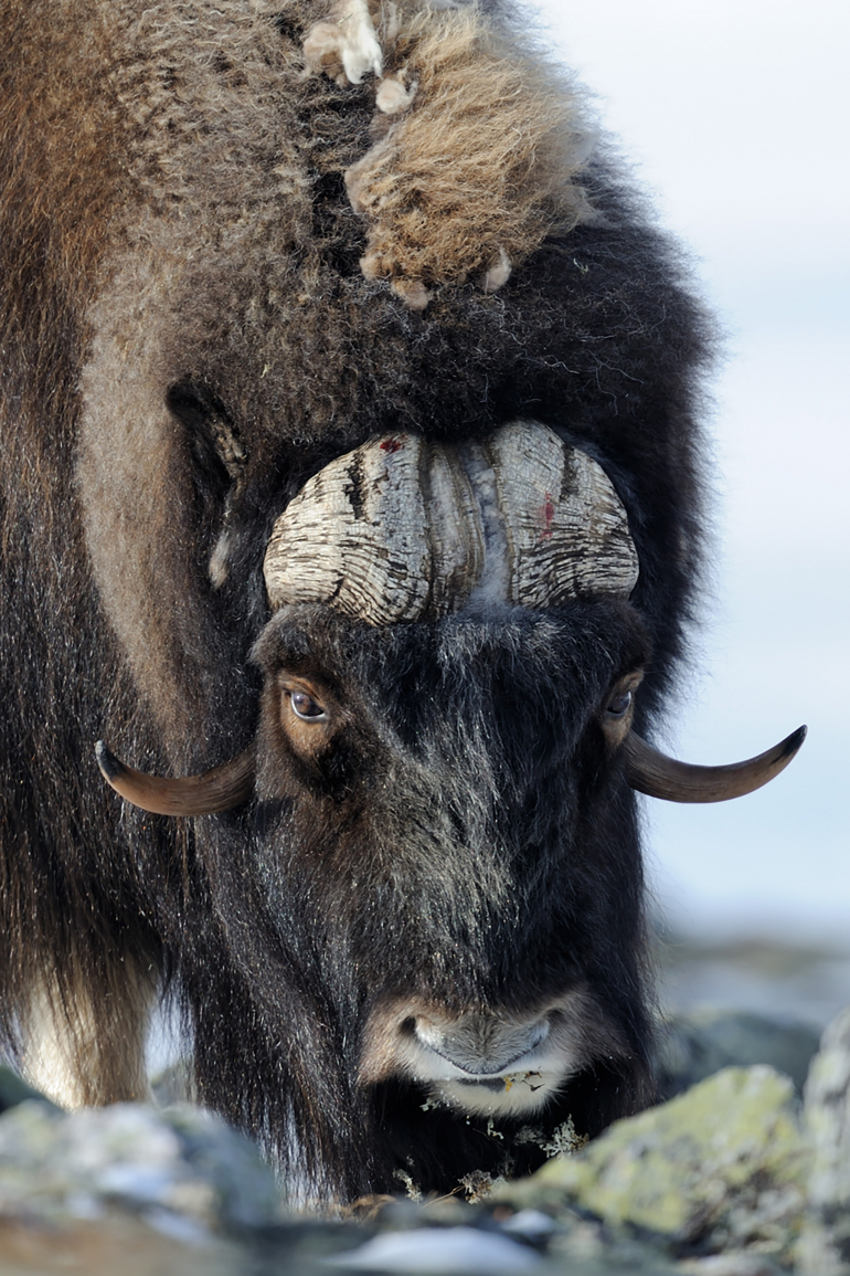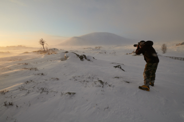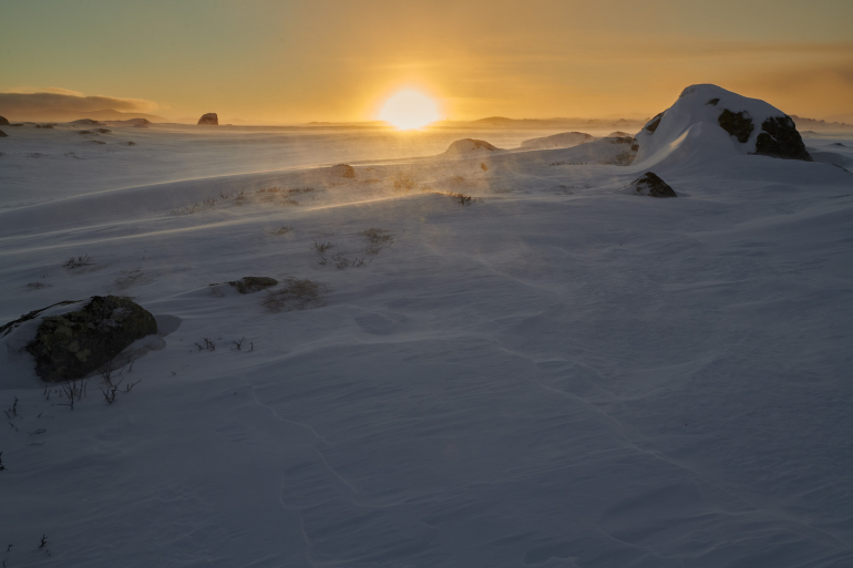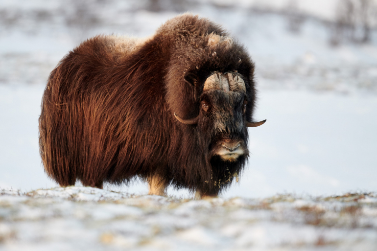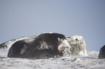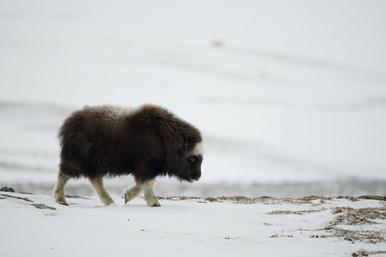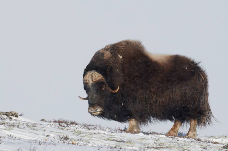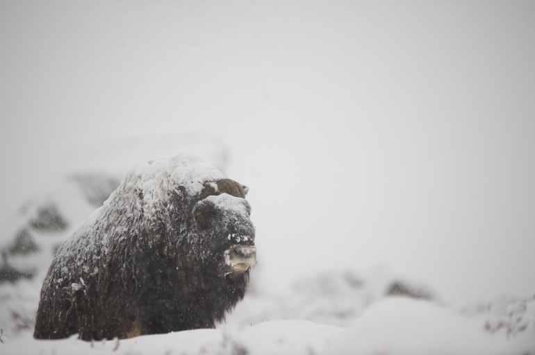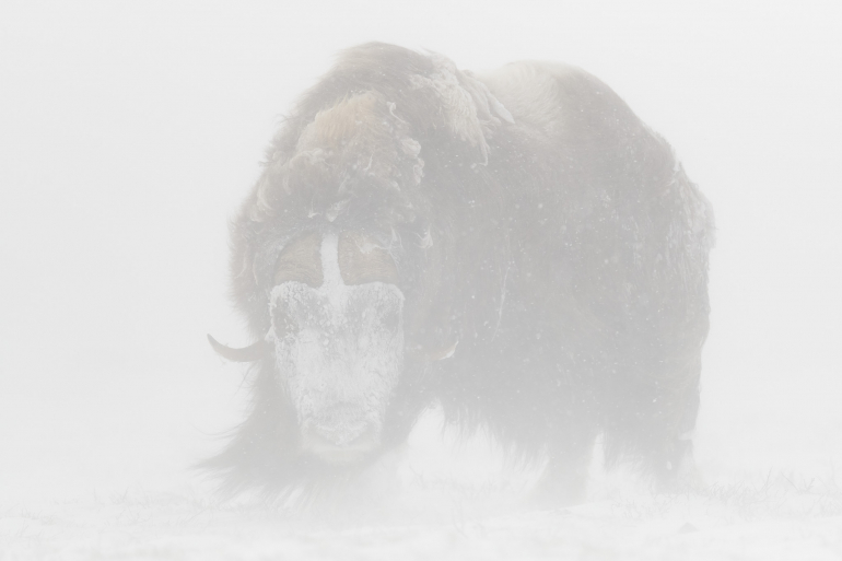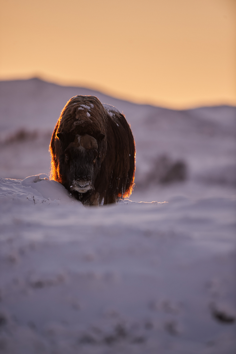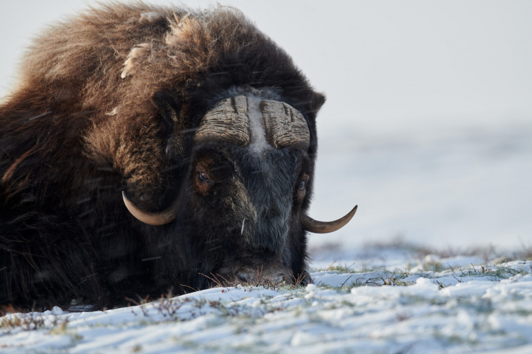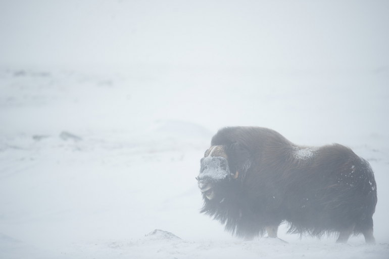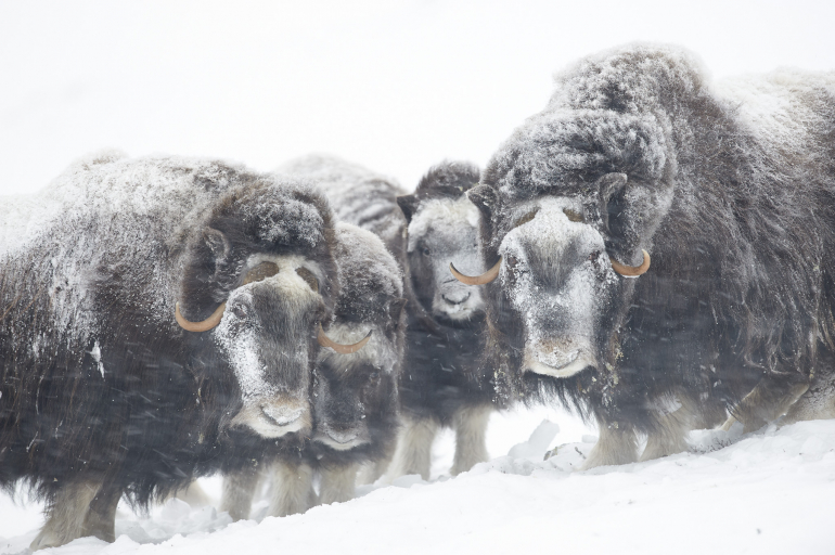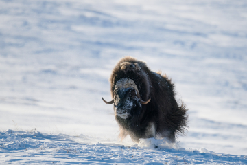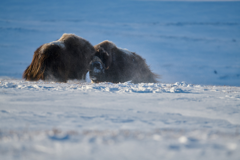 JOUR 2 À 6Nous partirons à la recherche des boeufs musqués accompagné d'un guide local en raquettes sur le plateau. Nous passerons la journée avec eux après une marche de 1h30 à 2h. Nous pourrons profiter de conditions météo différentes pour nos photographies. C'est quand le vent soulève la neige que l'ambiance est à son apogée photographique, que ce soit pour les photos de boeufs musqués ou des paysages alentours.