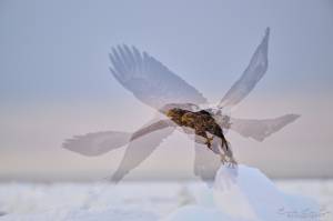 JOURs 10 et 11Après le petit déjeuner, départ pour la péninsule de Notsuke. La faune y est nombreuse : renards, cerfs, pygargues, hiboux des marais, goélands etc. La mer est gelée d'un côté de la péninsule et libre de l'autre ce qui occasionne une grande diversité de paysages, le soir la lumière y est magnifique ...