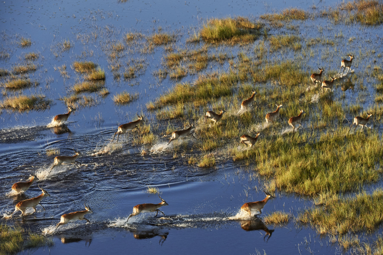 Couvert à plus de 70% par le désert du Kalahari, d'une superficie de 500 000 km2, Le Botswana est peuplé de moins de 2 millions d'habitants. Il possède une spécificité géographique extraordinaire : le delta de l'Okavango, joyau de l'Afrique australe. Venu d'Angola, le fleuve Okavango ne trouve jamais la mer et se perd dans le désert du Kalahari. Il donne ainsi naissance au plus grand delta intérieur du monde (plus de 15 000 km2) et transforme le désert en un jardin luxuriant.